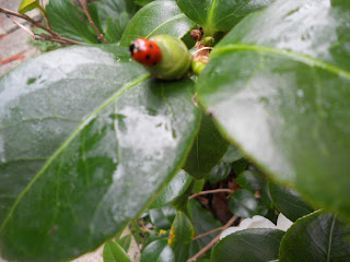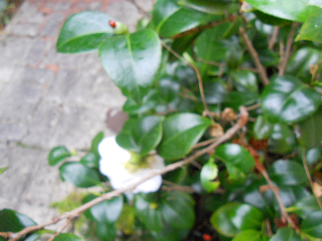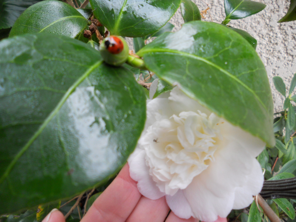 The first beautiful white camellia flower of the season. Do you see the bonus ...it's that little red spot teetering on another bud. Yeah, the one with black spots, a cute little ladybug.