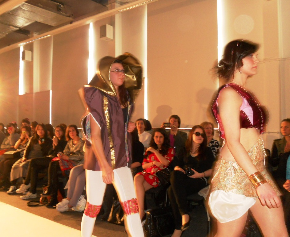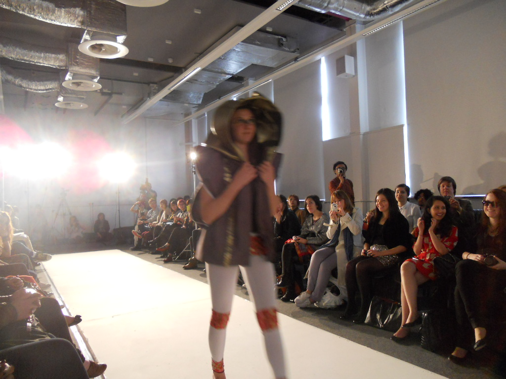 I Chunneled over to London recently to see Chloé in her first Fashion Show. She was one of the few first-year students selected by a jury based on a rendering of their project. The hitch is that they couldn't wear their own creations, so she partnered with another French girl about the same size, etc.