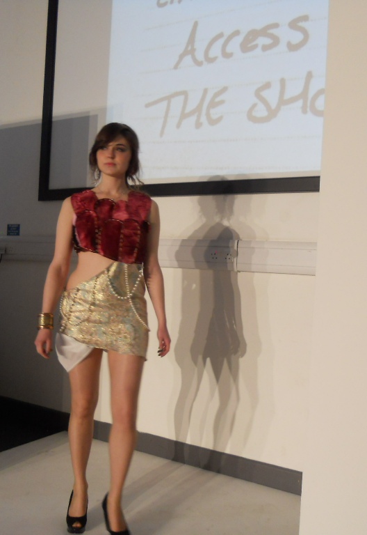 Her dress is an assymetrical cut with the bottom out of a brocade tapestry in gold, pink, blue with pearls draped as an accent.. The top is a bunch of arch-shapes in burgundy velvet with gold embroidery thread in a running-stitch and applied to a cotton bodice. At the last minute backstage she added a little extra piece of material on the high side of the skirt because the model didn't have all sheer pantyhose.