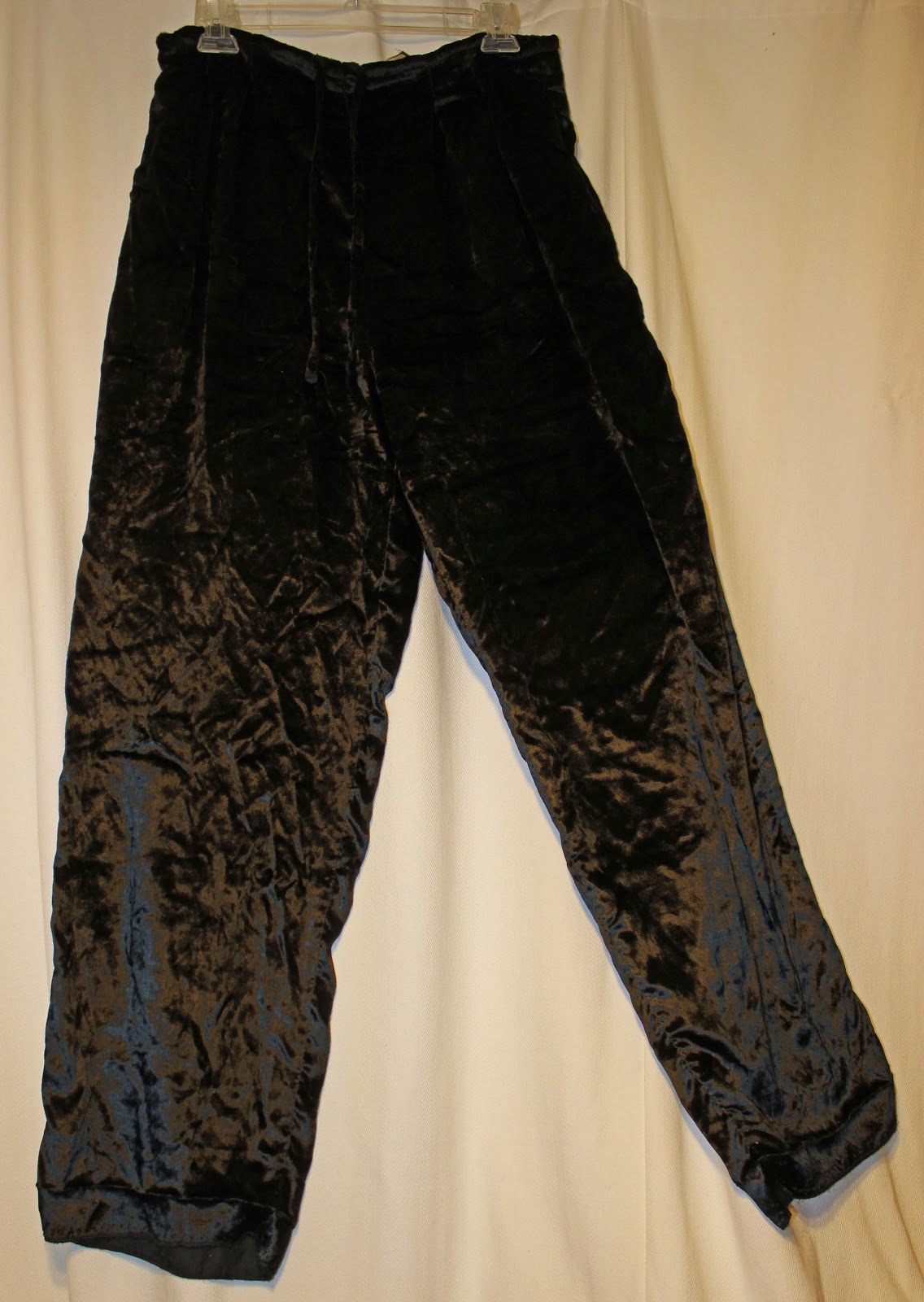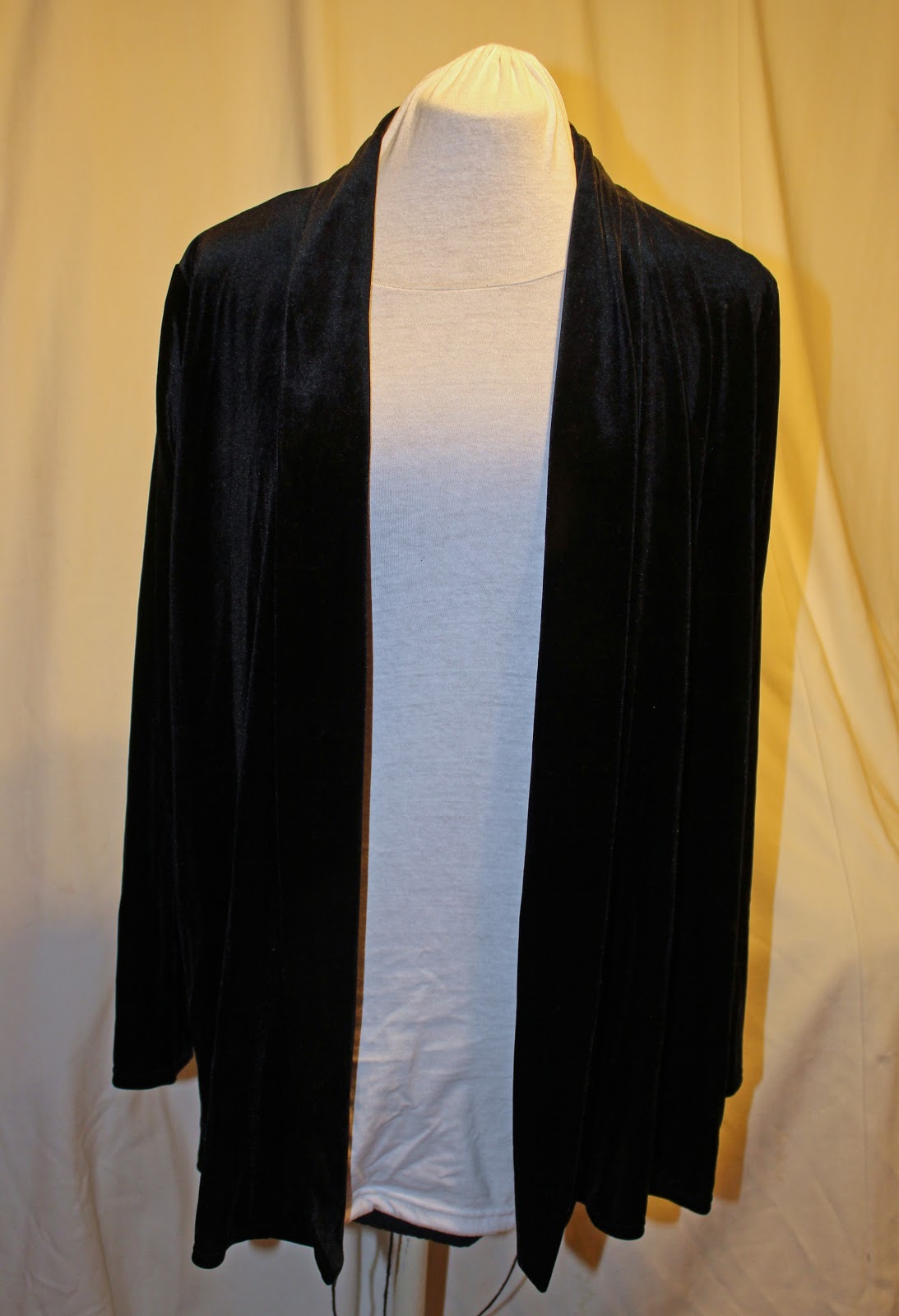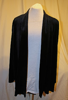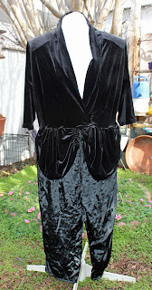I started with a loose fitting black velvet jacket. I marked the waist and cut it off leaving 1/2 inch for a seam allowance. I took in the sides of the top part of the jacket. To make it a bit more fitted, I added a pleat at the back and each side. I divided the bottom portion of the jacket that had been cut off into quarters. I chalked these lines so I could do the gathering later. I reattached the bottom part evenly distributing the excess fabric. I then serged this to the top part.