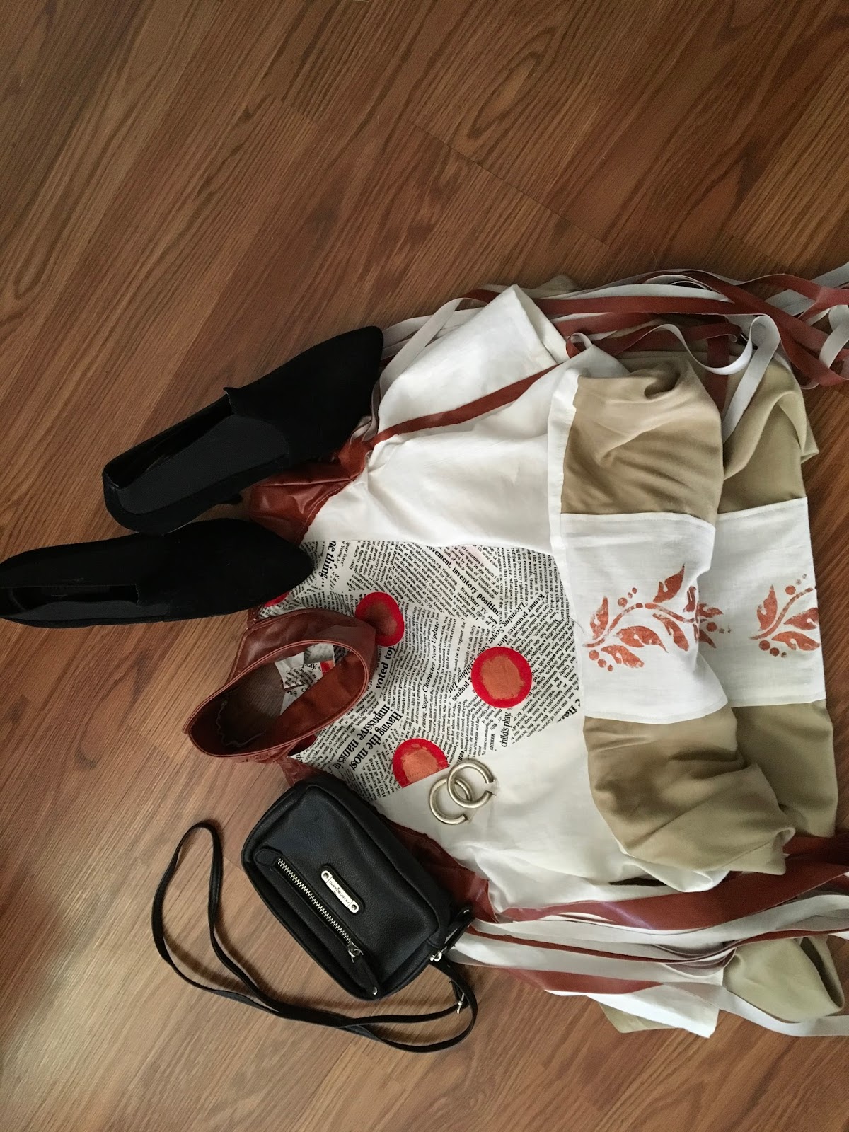 I started by painting the red dots on the newsprint fabric and stenciled a strip of white fabric to use down the front of the skirt.