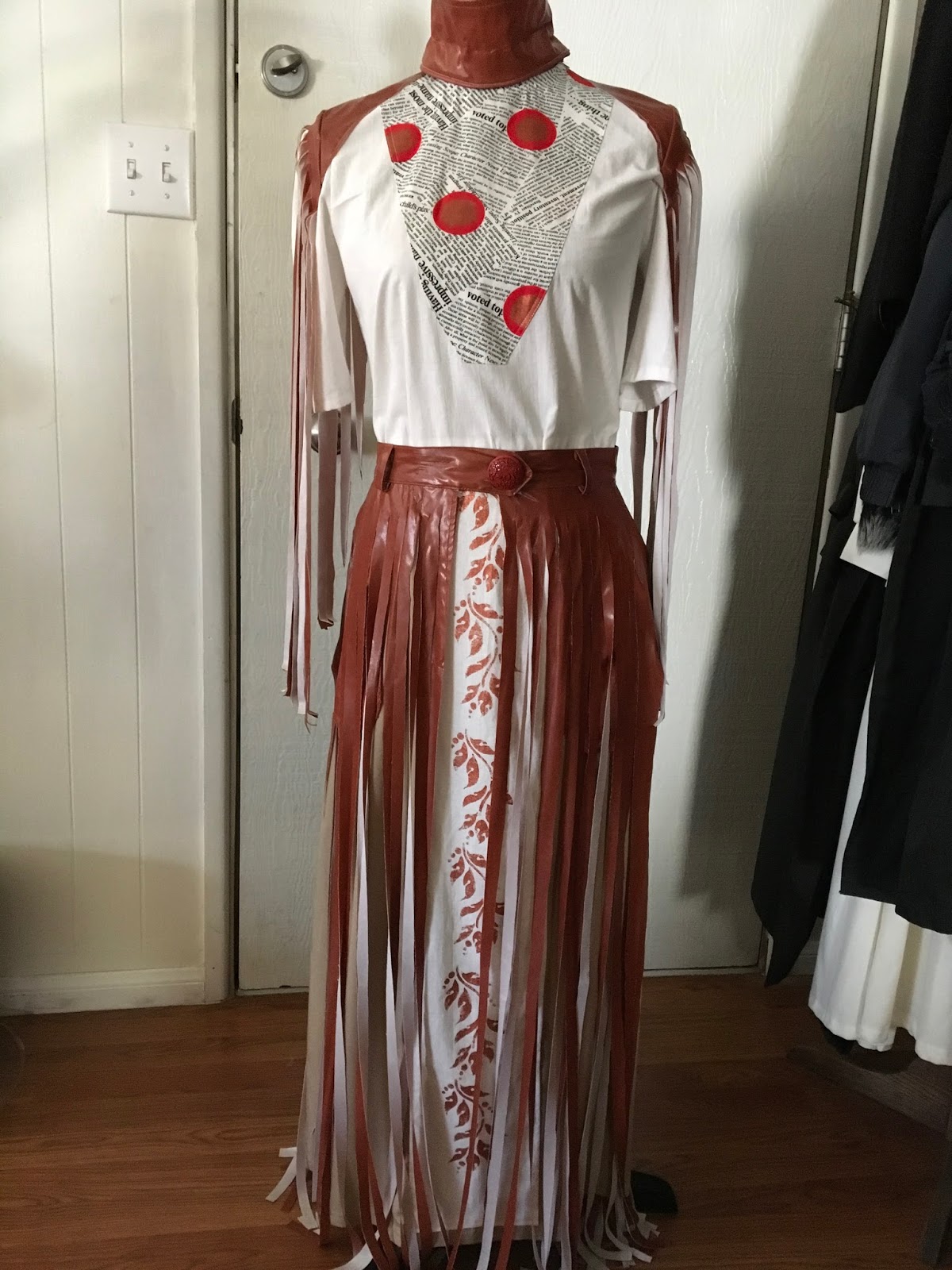 The vinyl suit was tricky to take apart. I had to handle it very gently to prevent damage to the material. I removed the center parts of the jacket and fringed the sleeves. I then attached the piece backwards to the bodice at the shoulders which allowed me to use the collar as a neckpiece.