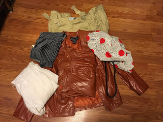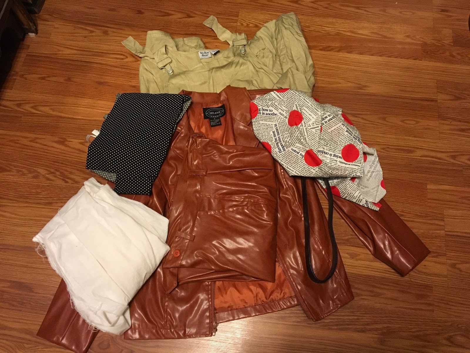 This winning look from Episode 2 was a tough one to redo from materials I already had. I finally landed on a vinyl pantsuit, off white cotton fabric, a newsprint fabric, and a maternity jumper, all of which are recycled. The pantsuit was from a friend, the white fabric had a former life (not sure as what) as it had a seam in it. The newsprint fabric was purchased at a thrift store (my original thought was to use it for purse lining). I picked up the jumper because of the fabric. Originally, I wanted to use the polka dot, but alas, it ended not fitting in.