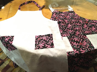 After I packed and shipped the kids costumes, I got started on a gift for my nephew’s fiancĂ©’s bridal shower, his and hers aprons.