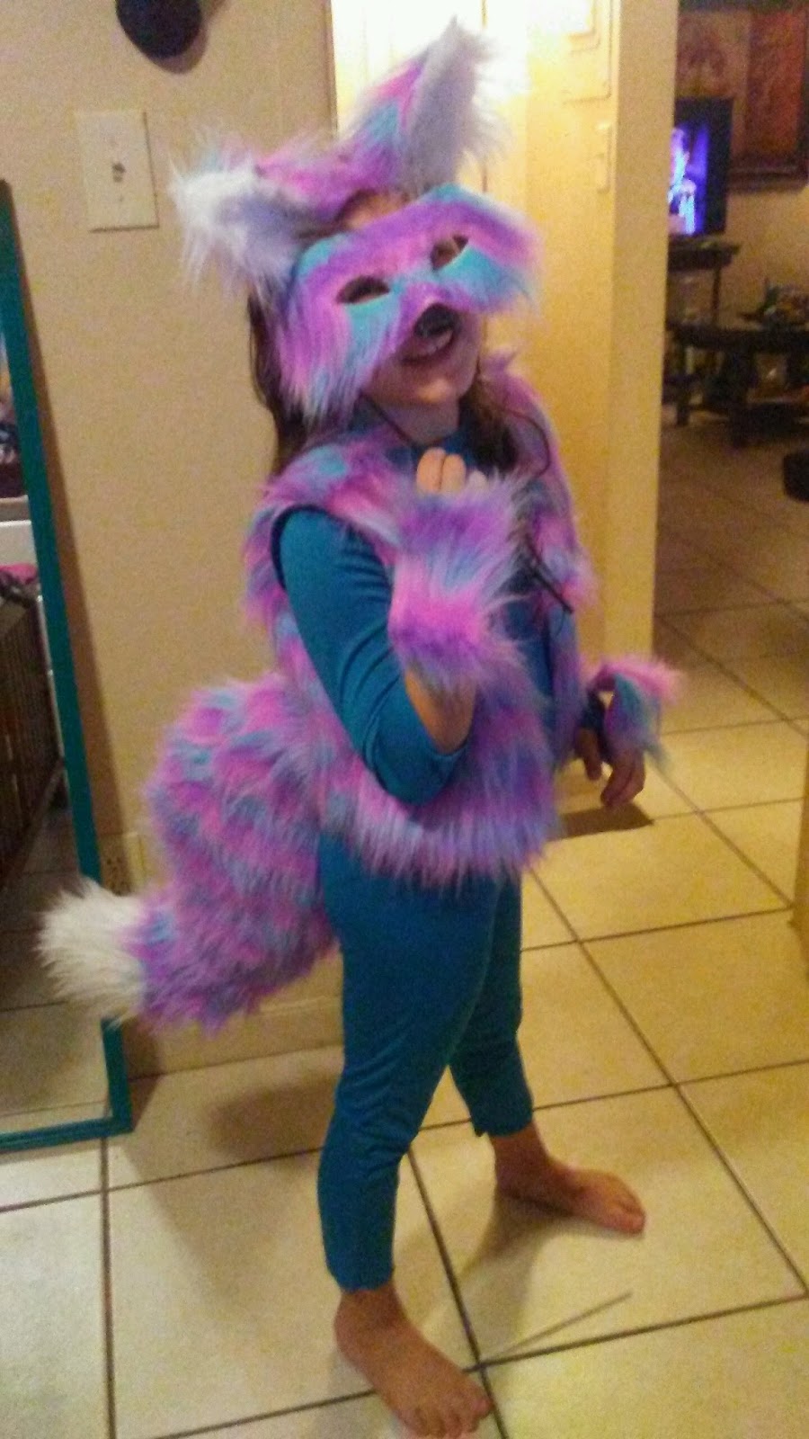 My oldest granddaughter is very creative. While she works with a lot of materials, she has yet to sit still long enough to learn how to sew. That hasn’t stopped her from drawing designs that I am commissioned to bring to life. This is the case with her Halloween costume. This year she wanted to be a “Cheshire fox”. Her sketch of the proposed final product is above.
